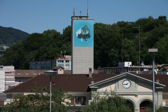 In an ominous foretelling to the subprime crisis, Peter Garfield’s flying mobile homes, about to crash and disintegrate, appear in monumental form on the side of a silo in Vevey that will soon also disappear. In addition, a solo exhibition is fittingly, and humorously, housed under the Medeival gables of the Musée Historique de Vevey.