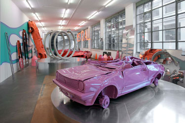 Is she being playful, or is she being perverse? Symbols of consumerism and glamour mix with the vestiges of crash tests and punctured Gucci bags. In mesmerizing videos, creatures of extraordinary beauty wash a 1960’s car in stiletto heels or drift around a mechanics work shop. Real-sized demolition cars are bright pink, red or purple, as if laquered with lady’s nail polish.