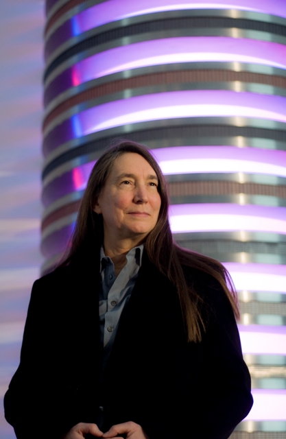 Portrait of Jenny Holzer in front of MONUMENT, 2008 in the exhibition “Jenny Holzer” in the Fondation Beyeler Text: Truisms, 1977-79; Inflammatory Essays, 1979-82 © 2009 Jenny Holzer, member Artists Rights Society (ARS), New York / ProLitteris, Zurich © Photo: Hassna Ouali