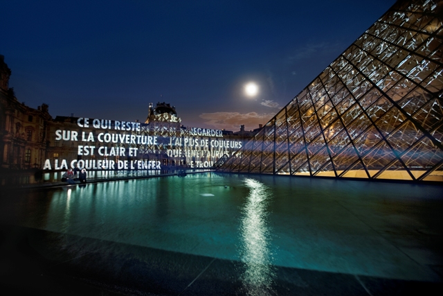 The development of LED technology (light-emitting diodes) offered Jenny Holzer a new range of possibilities, including the opportunity to wrap textual light around buildings and inside structures to enhance their intrinsic architectural beauty. This she did in 2001 with Mies van der Rohe’s legendary New National Gallery in Berlin and with Pei’s glass pyramid in the Louvre courtyard in Paris, both in 2001 and in 2009.