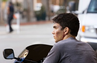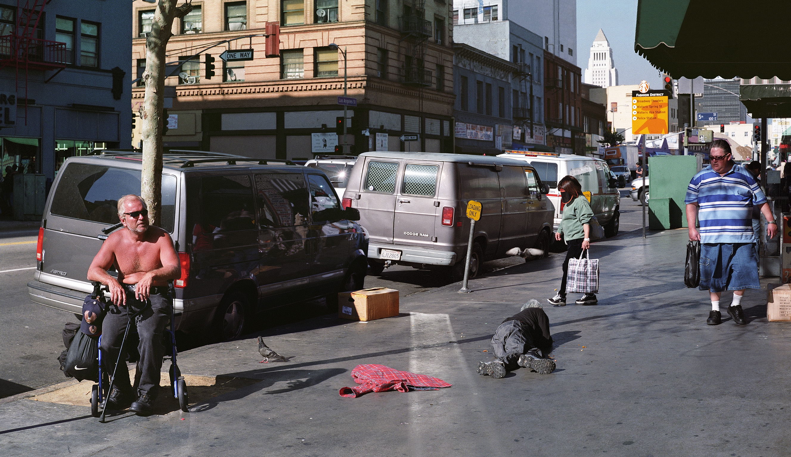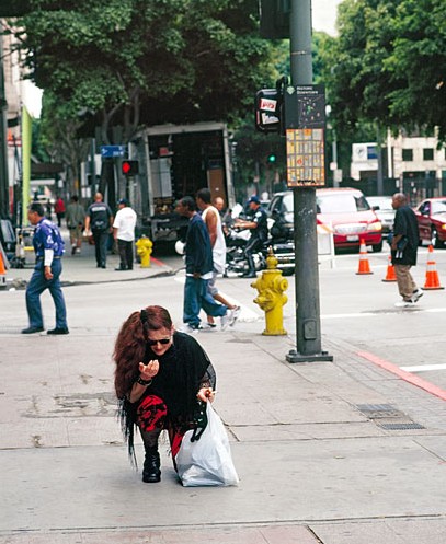 Under the bright sunshine of California, people loiter on sidewalks ignoring cadavers, cops arrest a young kid, a woman tramp kneels pathetically in the street. Life goes on.