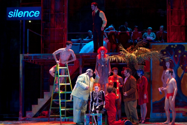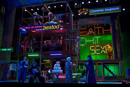 And yet, there is not much to rejoice about in the life of a woman whose charm is a killer. Corpses of lovers litter her path. It is all very messy and to emphasize the chaos, a circus environment permeates Py’s production, a theme actually present in Berg’s introduction.