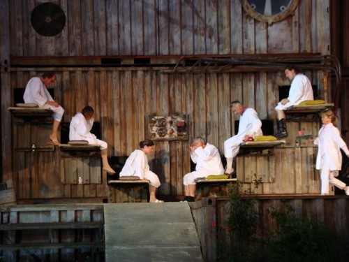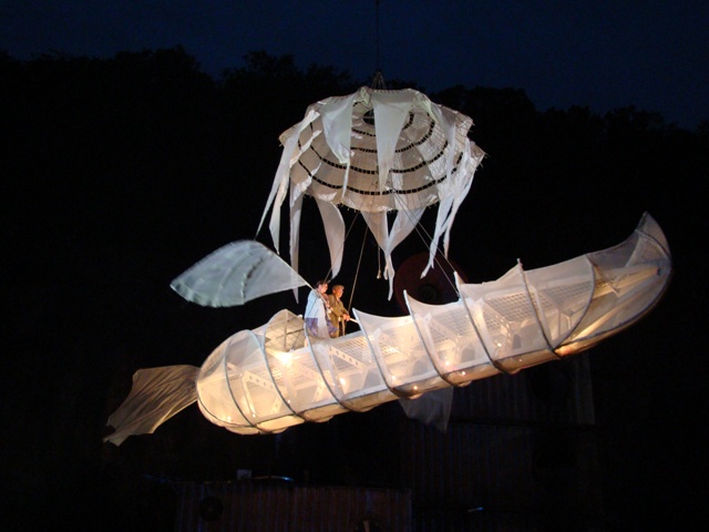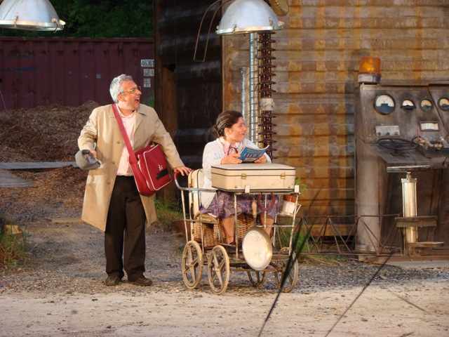 Although the audience is comfortably protected from the weather on bleachers covered by an awning, the actors play come rain or shine. “We are constantly flirting with danger,” they admit.