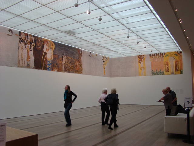 A replica of Gustav Klimt’s renowned Beethoven Frieze, painted in 1902 for the Vienna Secession greats visitors in the foyer of the Beyeler Foundation, photo Laird