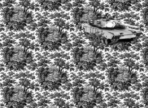 The artist highjacks the pastoral scenes of Toile de Jouy with the interruption of a blasting device like a tank