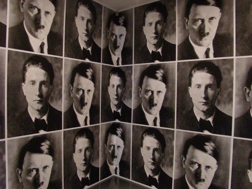 Rudolf Herz, Zugzwang, 1995, with the ironic juxtaposition of portraits of Marcel Duchamp and Adolf Hitler taken by same photographer. Custom-edited to fit a room at mudac, the work is exposed for only the third time