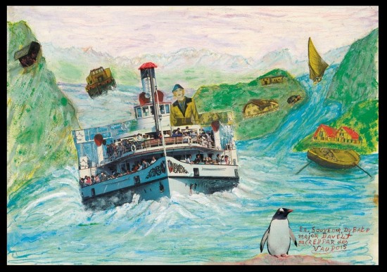 Francis Mayor (1904-1995): In memory of ‘Major Davel’, from around 1990, painting and collage on paper. Photo : Olivier Laffely, Atelier de numérisation – Ville de Lausanne, Collection de l’Art Brut, Lausanne Born in Lausanne to a single mother who tried to rid herself of him, Mayor lived his adult life first at sea and then working on Lake Geneva. The main themes of the collages that he made when he moved to an old person’s home were the sea, boats and religion.