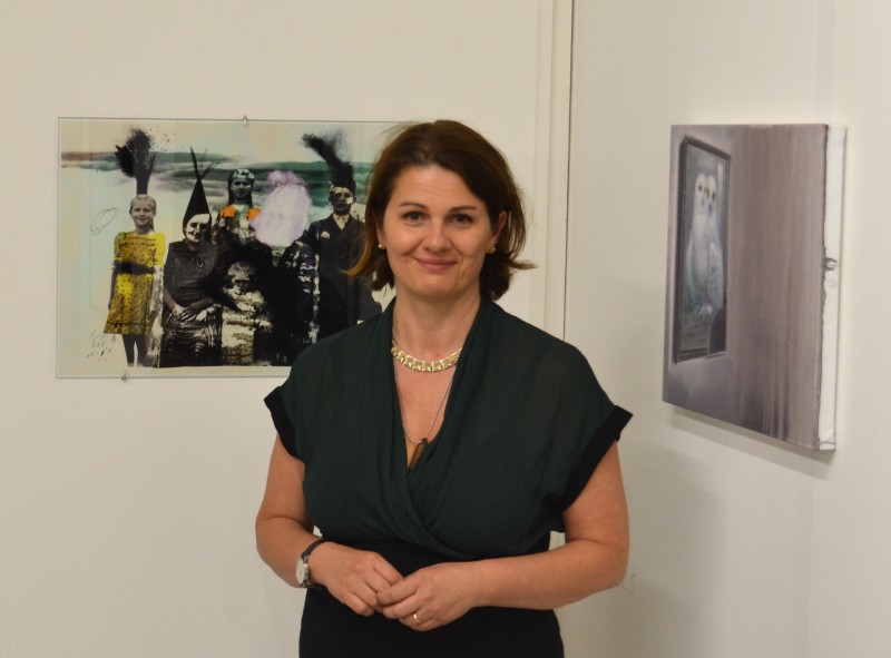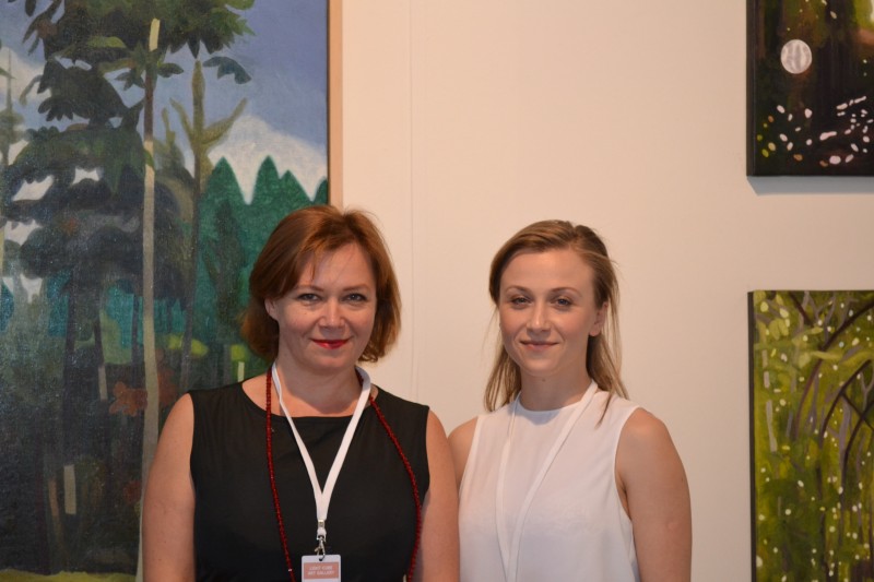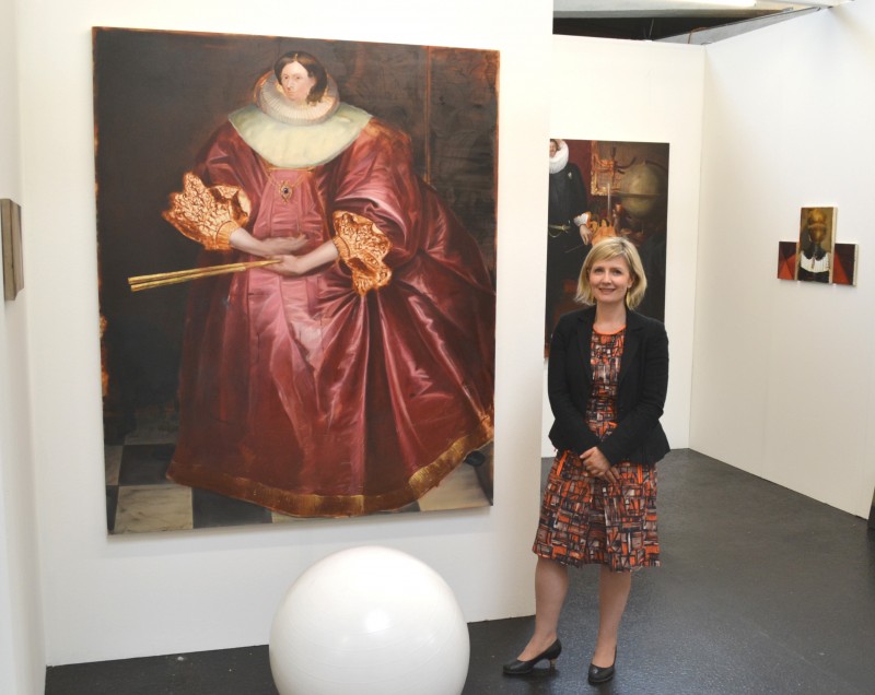 Paulette Terry Brien in front of paintings by the young Polish artist, Rafal Topolewski, who is currently studying for his Masters at the Royal Academy in London. The International 3, Photo © Michèle Laird