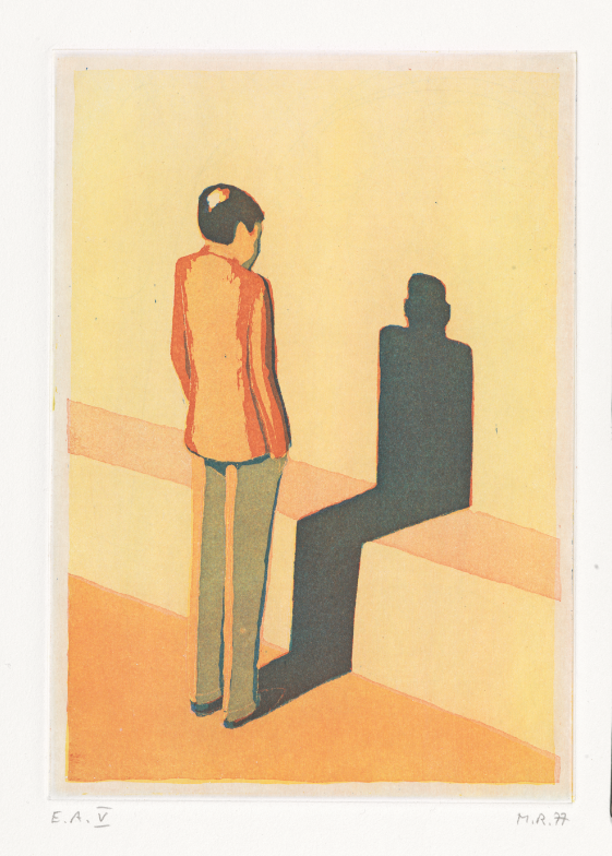 Männliche Figur, ihren Schatten betrachtend, (Figure masculine considérant son ombre), 1977, Aquatinte en couleur, 210 × 146 mm