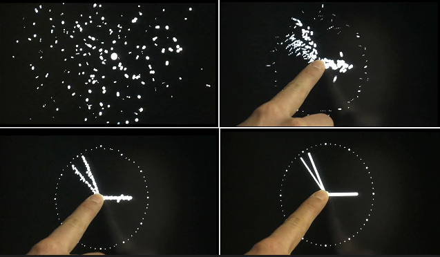 A screen displays a cloud of points that move randomly, but when it is touched the points gather to form a clock, until it is released and the points resume once again their random paths. Artist Eric Morzier says that the ephemeral formation of the clock reminds us that time continues inexorably.