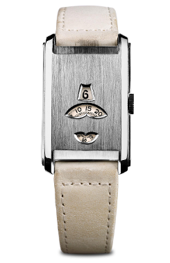 Example of a ‘jump watch’ – because the time segments ‘jump’ in packs of combined lengths. This 1935 Art Nouveau wrist watch has three windows, one for hours, one for minutes that jump every five minutes and a third one for seconds that jump every ten seconds.