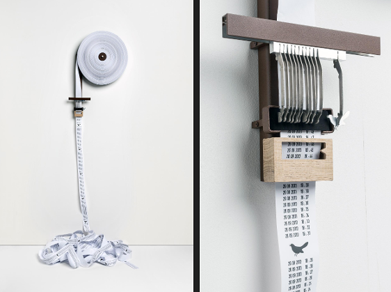 As the paper roll unwinds, time is printed out minute by minute, until the hour when a cuckoo ‘sings’ on the paper.