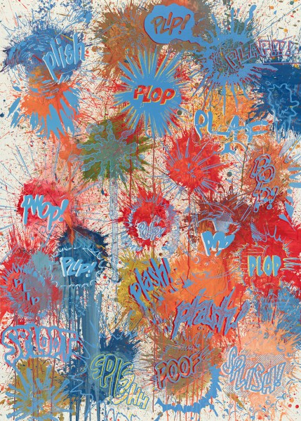 This time, the Swiss artist, who lives in London and New York, shifts our attention to sound, or rather to the silence of sound, when onomatopoeia allows us to hear what our eyes are telling us. Think of SQUISH or CRASH!
