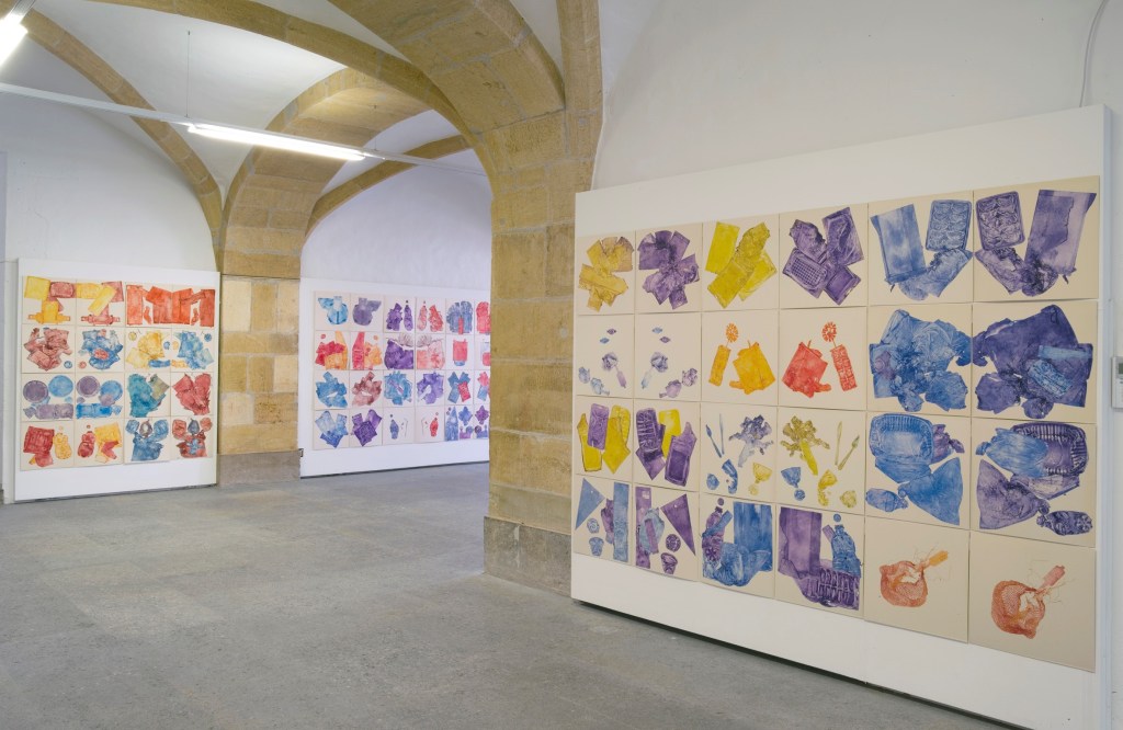 Pendant un an, de septembre 2017 à septembre 2018, l’artiste a réalisé deux estampes (recto/verso) par jour à partir de la consommation quotidienne en plastiques alimentaires de son couple, 26 kilos au total.