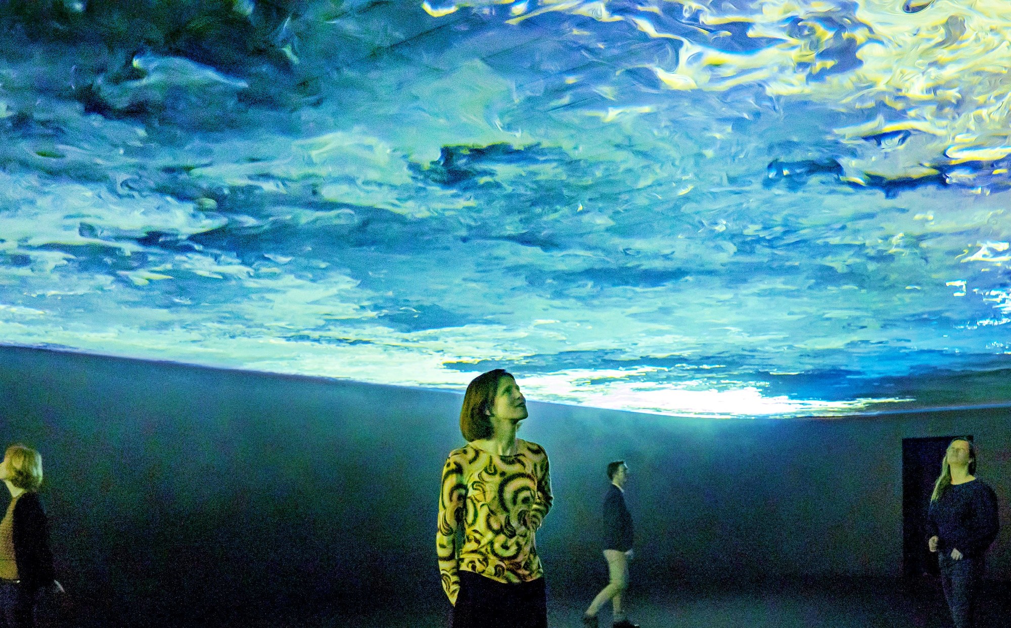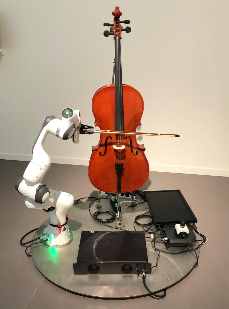 The dissolving ceiling highlights the guessing work of meteorologists when, for example, a swirl suddenly escapes from an ocean’s undertow, upsetting the balance in a current, obliging it to sink before it can rise again. We are standing below the metaphor of climate change, ensconced in a soundtrack composed by Hildur Gudnadottir that is played live on a cello by a robotic arm.