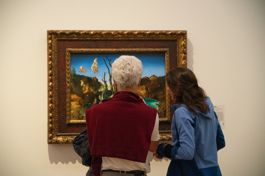 Viewers intrigued by Salvatore Dali’s“Cygnes reflétant des éléphants* [Swans Reflecting Elephants), exhibition Surrealism Le Grand Jeu, photo Etienne Malapert, MCBA
