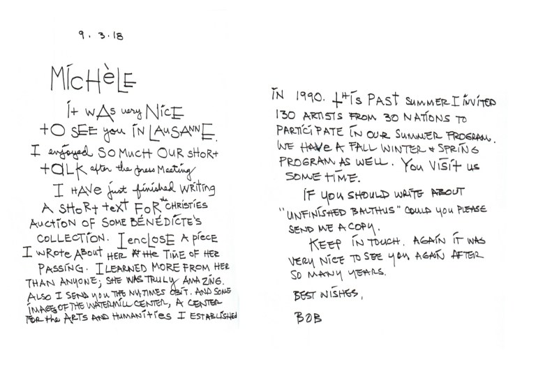 Nous étions comme deux vieux amis perdus dans nos souvenirs et quelques jours plus tard je recevais une magnifique lettre d’hommage à Bénédicte dans la belle calligraphie si distinctive et asymétrique de Bob.